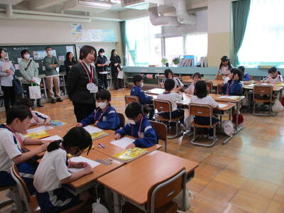 まる1年生 1学期のめあてづくりをしました。学習、生活、運動で何を頑張るか書いていました。途中、身体計測をする児童が、班ごとに分かれて保健室に向かいました。