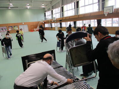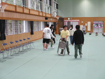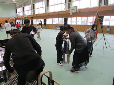 入学式後、午後の離任式に備えて、6年生のみなさんが式場の後片付けをしました。