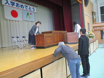 離任式に向けてステージ上へ演台と椅子を並べました。