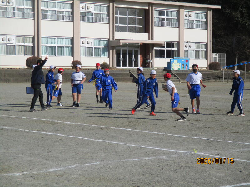 5年生 体育科 タグラグビーの練習をしました。あしたは「町合併20周年記念のタグラグビー交流大会」があるので、その練習をしていました。