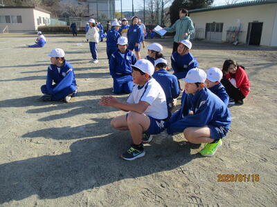 準備運動 けがのないよう念入りに準備運動をしました。タグラグビーをイメージして、元気な声を出す練習もしました。