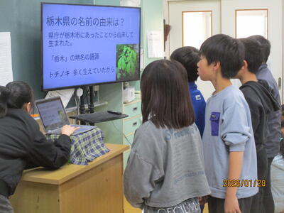 まる3班に分かれて、栃木県についての発表 スライドショーを使って、堂々と発表しました。中には、名演技をして表現した子もいました。