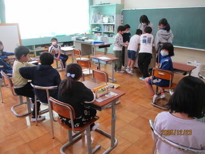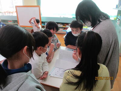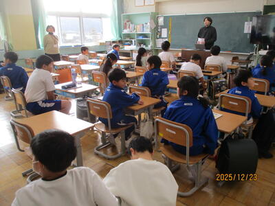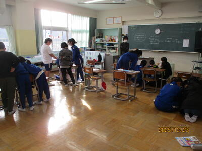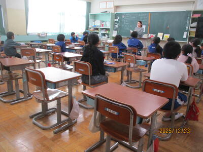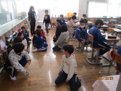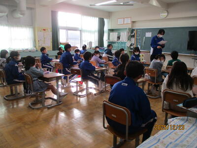 3年生教室では、昼休みに図画工作科の授業でつくったクリスマスツリーの仕上げをしていました。道具をシェアして、きれいでかわいらしいクリスマスツリーを仕上げていました。教え合ったり助け合ったりする姿がすてきで、心地よい雰囲気でした。