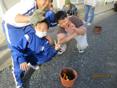 子供たちは、講師の先生から火のおこし方を教えていただいた後、二人一組になって火をおこしました。二人が息を合わせて、そして粘り強く火起こし器(まい切り式)を動かして、全員が火起こしに成功しました。