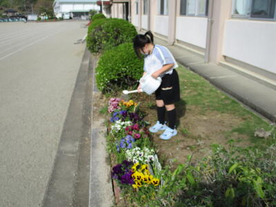 花丸朝、2年生の女の子が、学年花壇のパンジーにお水をあげていました。