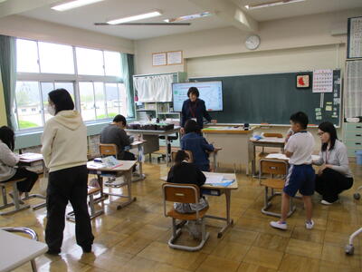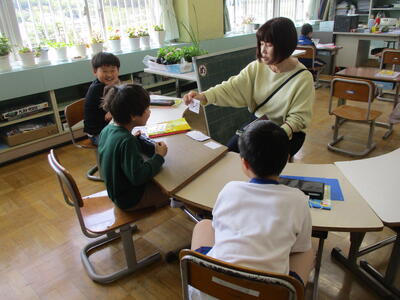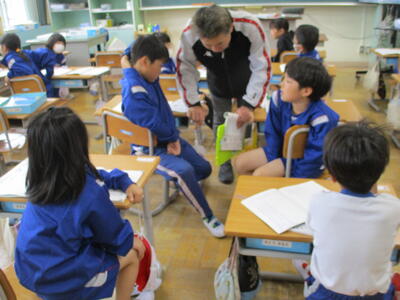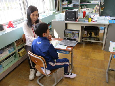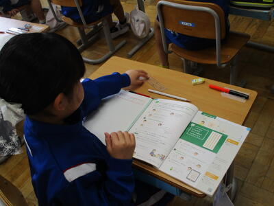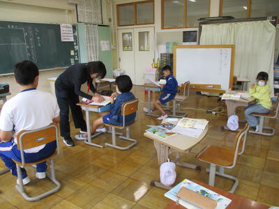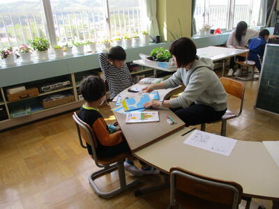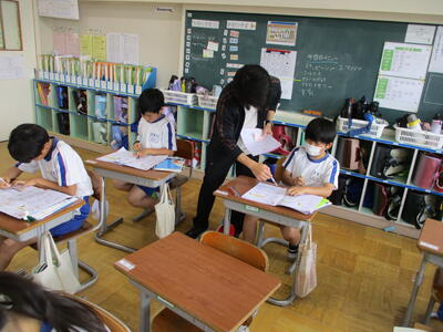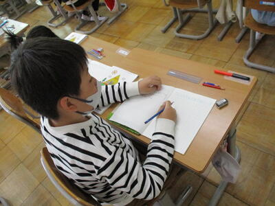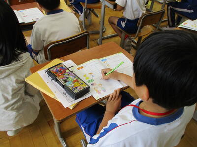 まる1年生 1学期のめあてづくりをしました。学習、生活、運動で何を頑張るか書いていました。途中、身体計測をする児童が、班ごとに分かれて保健室に向かいました。
