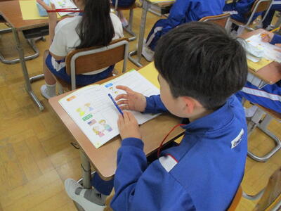 まる5年1組 外国語科  アルファベットの発音を聞き分ける学習をしました。