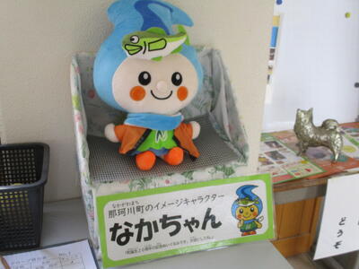 花丸玄関に飾られた「なかちゃん」のぬいぐるみ。見やすいように、“なかちゃん専用椅子”を職員が作って飾ってくれました。