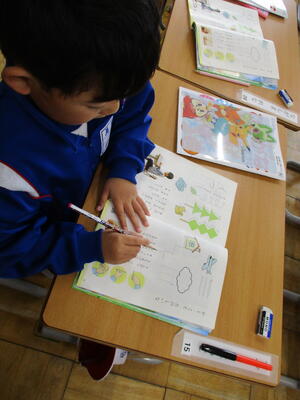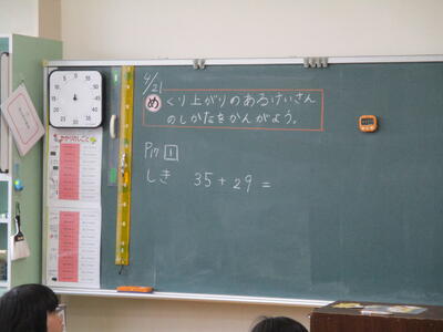 まる2年生 算数科 2桁の数の足し算を、生活場面を考えながら学習しました。みんな大きな声で考えを発言し、とても活気のある学習でした。