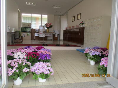 来賓玄関 入学式に備えて、お花がたくさん準備されています。