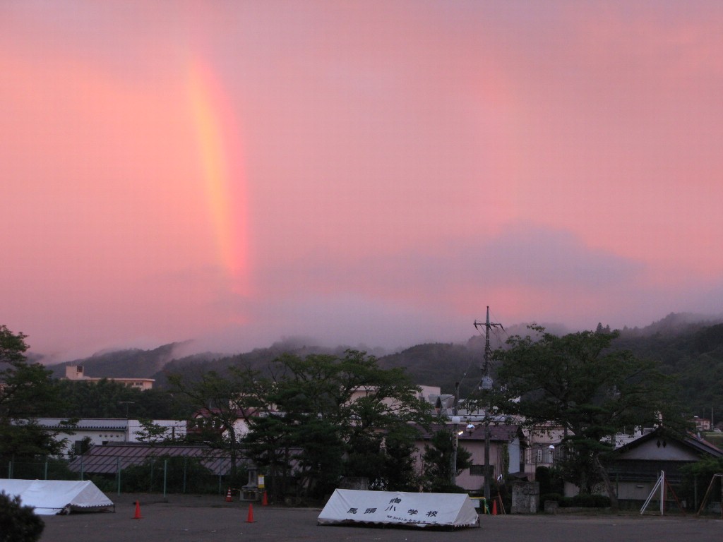 9月6日(木)、午後6時ごろ、職員室窓から見て馬頭小学校校庭の南に虹がかかりました。夕焼けの空にかかった、色のとても濃い虹です。外側にも薄い色の虹がかかっています。 (写真はクリックすると拡大できます)