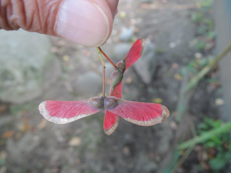 カエデの実(種)が付き始めました。ヘリコプターの羽根のような形で、ピンクのきれいな色です。一見、花が咲いているかのようですが、実です。秋になると、しっかりとした種ができ、羽根も乾燥して、ヘリコプターの羽根のように回りながら飛んで行き、子孫を残そうとします。