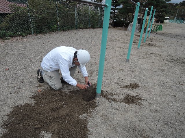 10月23日(水)、専門業者による遊具の点検が実施されました。校内の施設・設備については、毎月、定期的に安全点検を実施していますが、特に、子どもたちが使用する頻度の高い遊具については、隔年ごとに専門業者により点検が行われています。前回の点検では、鉄棒のぐらつきが指摘されており、これについては、修繕いたしました。(写真は、修繕状況を確認しているところ) また、今回の点検においては、緊急の危険度ではないのですが、ブランコとシーソー、サッカーゴールへの注意が指摘されています。これについては、今後、計画的に改善をしてまいります。