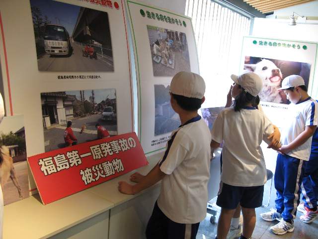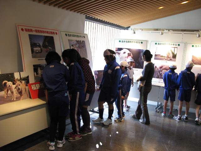 10月26日(金)、馬頭広重美術館視聴覚研修室ギャラリーで開催されている、「鼓動」写真展―感じて欲しい小さな命の重み―を見学してきました。見学に参加したのは、4年生以上の希望者134名で、昼休みの時間を利用して見学しました。この写真展は、東日本大震災・福島第1原子力発電所の被災地に取り残された犬や猫、1300余頭を、身を挺して救出した「犬猫みなしご救援隊」の1年間の記録です。人間と一緒に暮らしていた犬や猫は、なかなか一人(一匹)では暮らせないようです。くさりが解き放されても、いつまでも自分の家で待っている犬、あばら骨がみえゴツゴツにやせた犬、予防注射などをしてもらえずフィラリア症などに感染して死亡してしまった犬など、命の大切さについて考えさせられる内容です。見学した児童の中にも、死んでしまった犬の写真に静かに手を合わせている児童もいました。