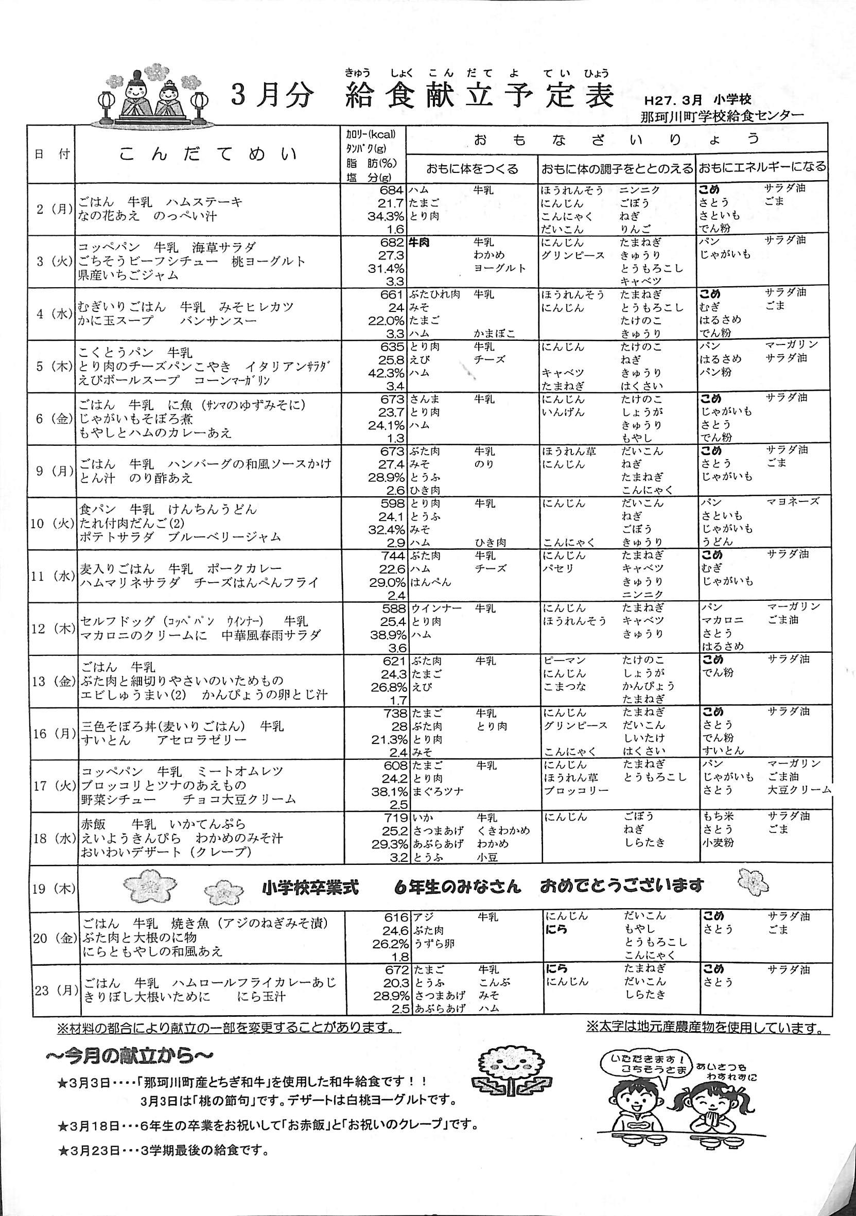 3月 3日 「那珂川町産とちぎ和牛」を使用した和牛給食です。「桃の節句」デザートは白桃ヨーグルト