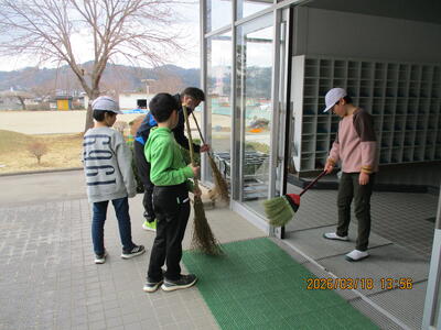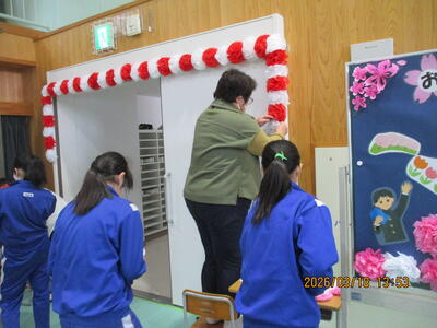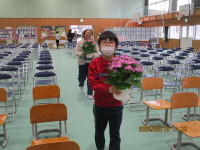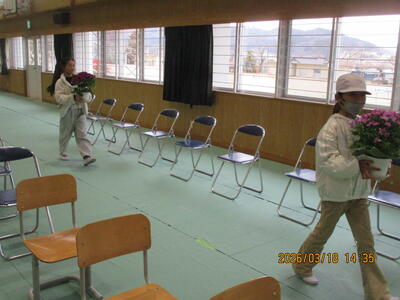 午後、4、5年生が卒業式場づくりをしました。飾り付けをしたり清掃したりして、明日の卒業式が6年生にとっての思い出となるよう心を込めて作業をしました。