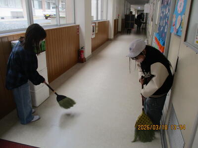 廊下の清掃 卒業生の動線となる廊下をきれいに掃いて、その後、拭き掃除をしました。