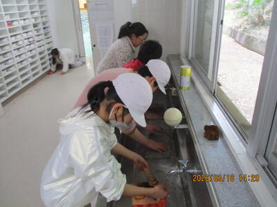 教室の荷物を運び出して、水ぞうきんをかけてきれいにしました。5,6年生が低学年教室のお手伝いに駆けつけてくれました。