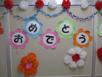 入り口の装飾 紅白の花を飾りました。
