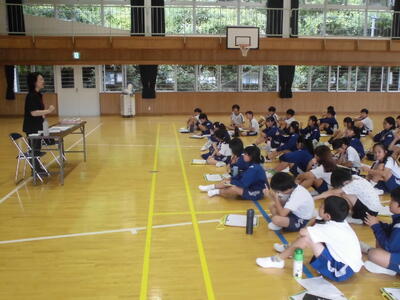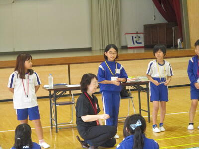 開会行事 教育長さんからごあいさつをいただき、その後、スクールの進め方の確認をていねいにしました。