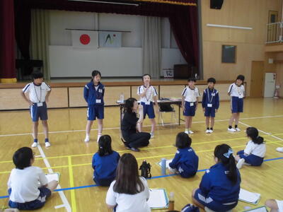 1年生 国語科 「やくそく」という青虫が成長する過程を描いた物語の音読発表会をしました。4人一組となって、役割分担して進めました。姿勢良く、声をそろえて音読し、会話文は、一人で音読して様子を伝えていました。聞き手も真剣にできていました。