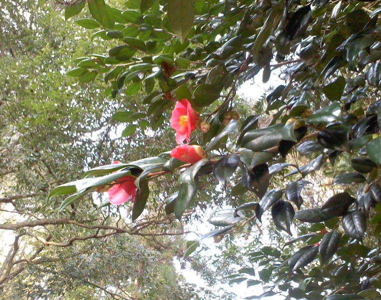 ツバキは、日本や中国をはじめとした東洋が原産のようです。18世紀には、キリスト教宣教師によってヨーロッパにも伝わったそうです。その後ヨーロッパでは観賞用として流行しました。ヨーロッパでツバキと言えば、ヴェルディのオペラ「椿姫」ですね。日本の歌では、都はるみの「アンコ椿は恋の花」が有名です。ちょっと古いですか?では、小林幸子の「雪椿」はどうですか?・・・これも古い? 映画では、何と言っても黒澤明監督の「椿三十郎」でしょう。襲撃の合図に、椿の花を水路に流すという仕掛けが何とも絶妙でした。モノクロ映画ですが、赤と白の椿が、自分の記憶の中ではカラーで残っています。椿の花は、花びら一枚一枚散り落ちるのではなく、丸ごと落ちるので、それがら首が落ちる様子を連想させるので忌み嫌われるようです。武士たちの抗争を描いた映画だけに、いかにも黒澤監督らしい洒脱な使い方でしたね。