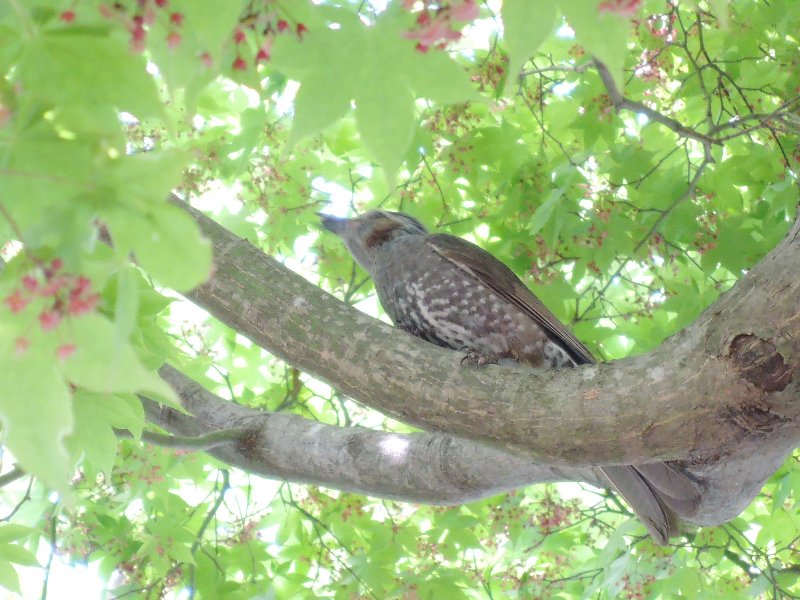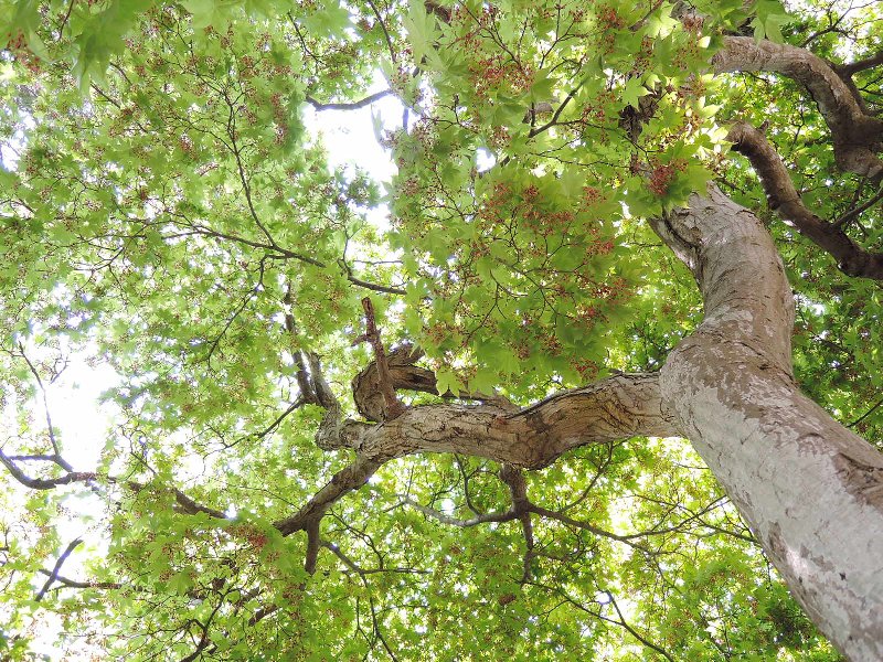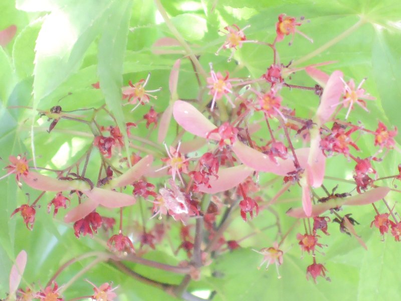 カエデの実(種)が付き始めました。ヘリコプターの羽根のような形で、ピンクのきれいな色です。一見、花が咲いているかのようですが、実です。秋になると、しっかりとした種ができ、羽根も乾燥して、ヘリコプターの羽根のように回りながら飛んで行き、子孫を残そうとします。