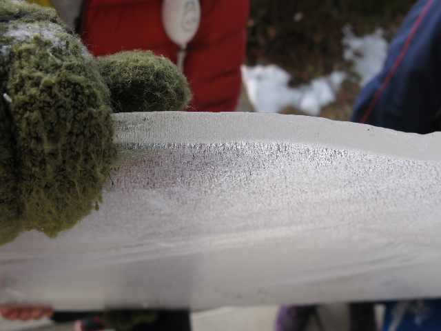 1月16日(水)、朝、登校するなり、児童が職員室前まで厚く大きな氷の板を運んできました。ブランコの下にたまった水が凍ったものを取ってきたそうです。冬型の気圧配置が強まり、冷え込んだ今朝の気温は、外の寒暖計ではマイナス6度でした。氷の厚さは、11ミリ。