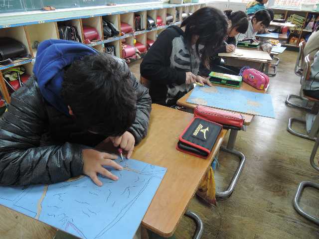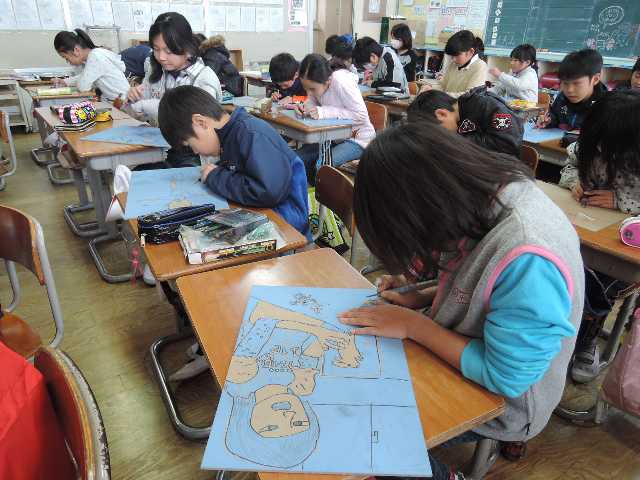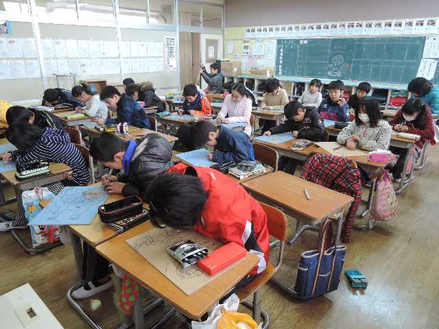 図工では、毎年12月頃は、どの学年も版画製作を行っています。昔は、よく年賀状の版画を彫りましたね。年が明けると、下野教育美術展・版画展が開催されますし、広重美術館でも版画コンクールを行っています。これに向けて、一生懸命版画製作に励んでいます。今回は、5年生の教室を訪問した時の写真を紹介します。