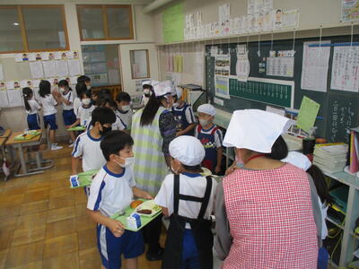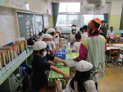 今日は、5年生の給食の配膳から会食の様子をお伝えします。