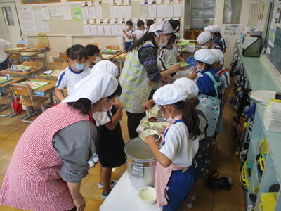配膳の様子 当番を務める児童の給食は、協力し合って過不足の内容にしています。