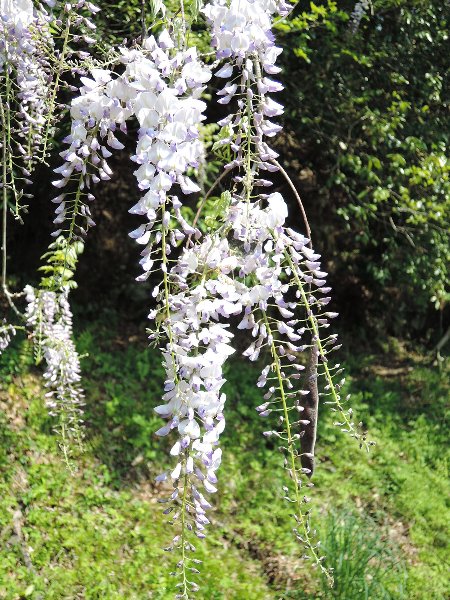 北校舎裏の山の斜面の藤の花が満開となりました。まるで、滝が流れ落ちるように、垂れ下がっています。また、学校の藤棚は、白と紫の藤の花が咲き始めました。