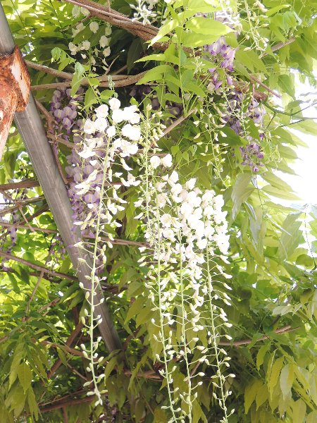 3・藤棚は、白と紫の藤です。 4・ハチが密をもとめて飛んできています。
