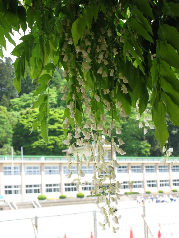 藤棚の白藤の花が咲いています。今年は、花の付き方が、いまひとつですが、真っ白の花がずらりと垂れ下がる姿は美しいですね。また、その脇の木の上の方に目を向けると、カエデの花らしきものが咲いて?います。ピンク色です。よく調べてみると、これは、花ではなく、種子のようです。形が、飛行機のプロペラの羽根のようになっていて、実際に枝から離れると、風にのって遠くへ飛んでいき、子孫を増やすのだそうです。(5月18日撮影)