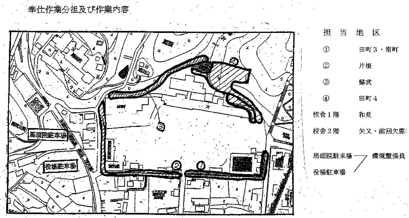 - 作業分担・・・校庭南・東土手(田町3・南町)、校庭南・西土手(片根)、体育館裏~北校舎裏池から西半分(健武)、校舎裏東から松風館と池まで(田町4)、校舎1階窓拭き(和見)、校舎2階窓拭き(矢又・前回欠席)、馬頭院駐車場・役場駐車場(環境整備部員) ※ 作業分担図参照