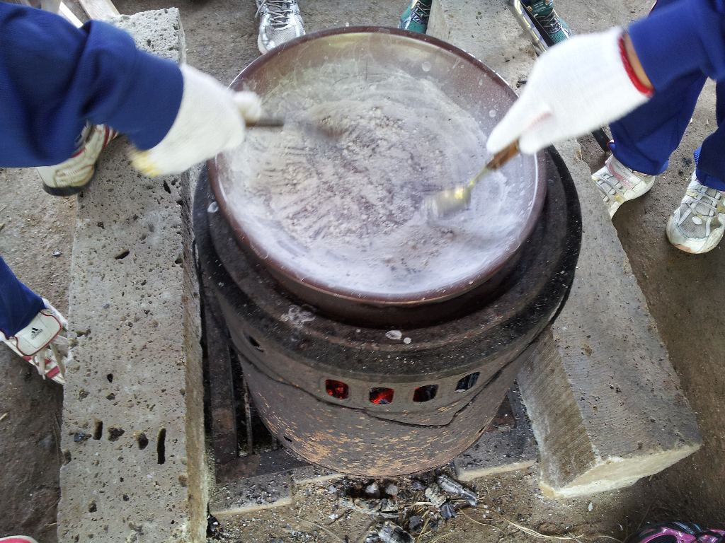7月10日(火)、臨海自然教室2日目午前の活動は、「塩作り」です。玉田海岸の海水を汲んできて、塩作りに挑戦します。海水をかまどで煮詰めて蒸発させ、塩の結晶を作り出すことができました。