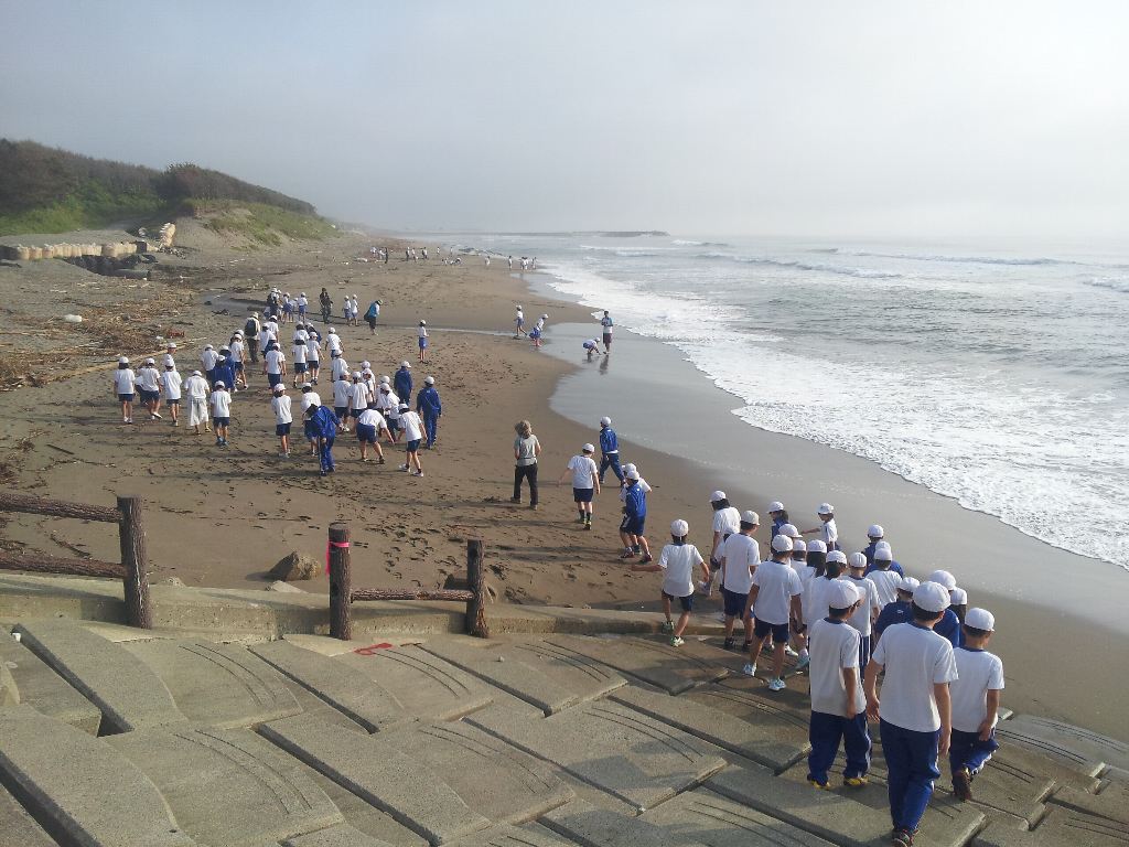 7月9日(火)、臨海自然教室に出かけている5年生は、鹿島灘海浜自然公園に到着しました。ご覧ください、晴れ渡った空と真っ青の海!やや早めの昼食をとり、これから、海岸で自然観察開始です。