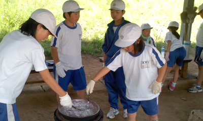 塩作りをしました。まず、海岸で塩水をくみました。そして、薪の準備ができると火を起こして、塩水の水分が蒸発するまで火にかけておきます。きれいな白い塩の粒がとれました。できた塩はみんなで分けました。お土産にしますのでお楽しみに!