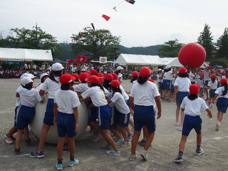【地球は回る】 全校生が参加します。1~3年はころがし、4~6年は、頭上に持ち上げ運び、リレーします。大接戦の末、白の勝利。