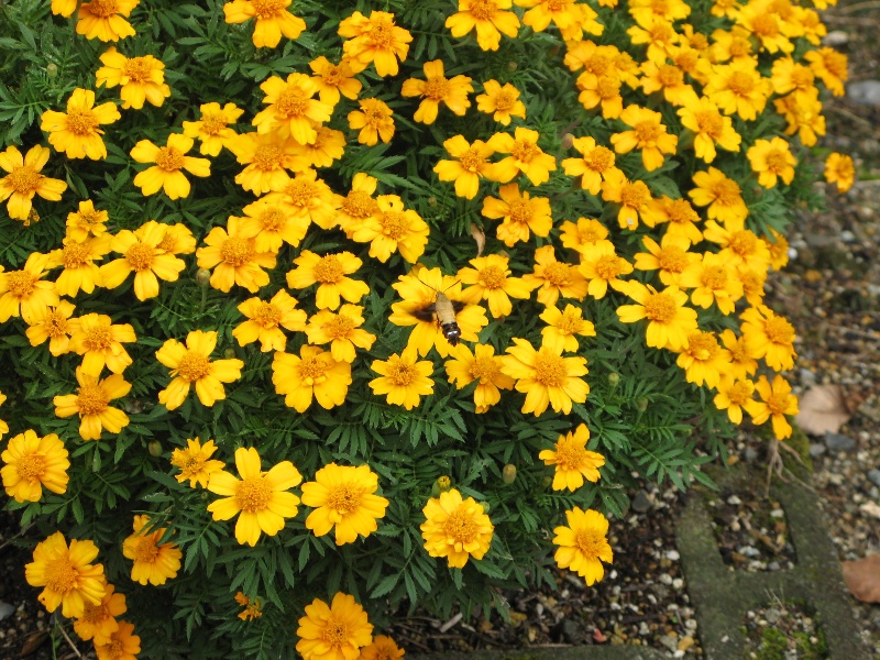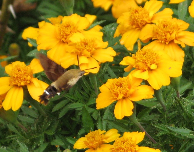 さて、マリーゴールドの花が満開。そこに何やら見かけぬ、チョウ? ハチ? ・・・ハチのように羽根を高速回転させ、ホバーリングしながら、口から長いストローのような口吻で、花の密を吸っています。ネットで名前を調べてみると、どうやら「オオスカシバ」のようです。