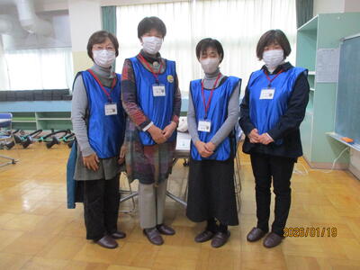 ボランティアのみなさんは、朝早くに来校されると「地域ルーム」に入り、シンボルの青いビブスと名札を身につけて、家庭科室に向かいました。
