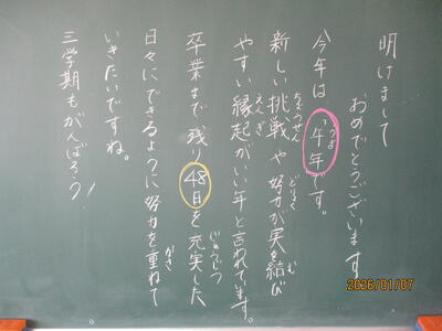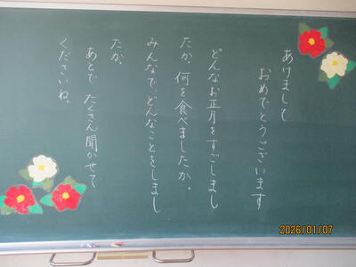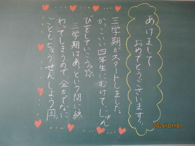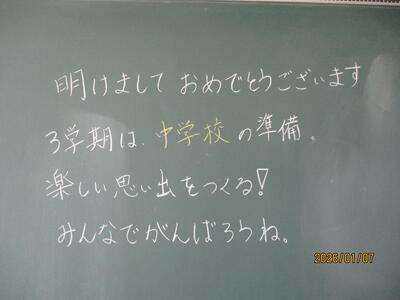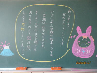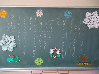 今日の3学期のスタートを前に、各教室では担任が子供たちを迎えいれようと教室にすてきなメッセージを記しています。子供たちは、教室に入っていろんな目標をもったことと思います。