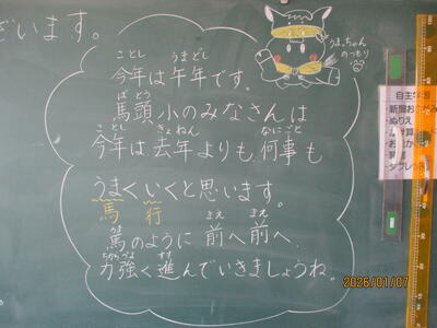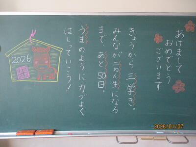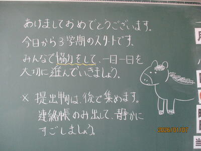令和8年に入り、第3学期が始まりました。今年の干支は「午」。馬は力が強く、行動力のある動物と言われ、転じて「午」年は、努力やがんばったことが実を結び成功する年と言えるでしょう。