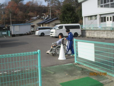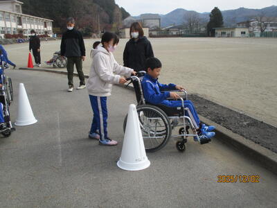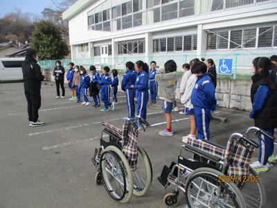 体育館で車椅子での介助の仕方を学んでから、校庭に出て2人一組になって、お互いに乗る立場、押す立場を体験しました。お互いに声を掛け合って、感謝の気持ちをもつと安心できることを学ぶことができました。
