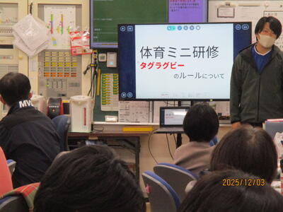 放課後の職員研修の時間に、「人権教育」と「体力向上・タグラグビー」についての研修を行いました。それぞれ、提案者からの投げかけに自分の考えをもちながら学び合い、知識を高めていました。