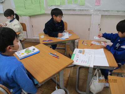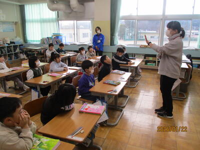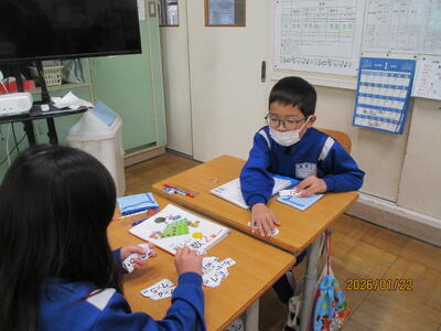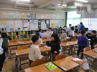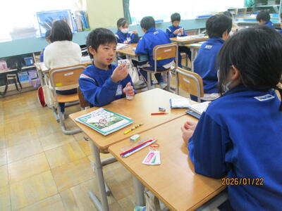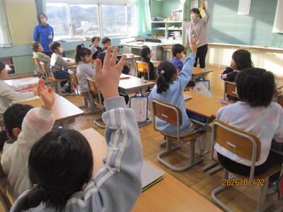1年生 朝の会 当番の進行が上手で早く終わりました。早く終えたご褒美に「みんなで5回じゃんけん大会」を開いて、朝の元気力が一段とアップしました。