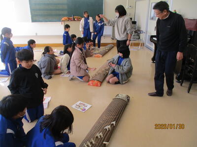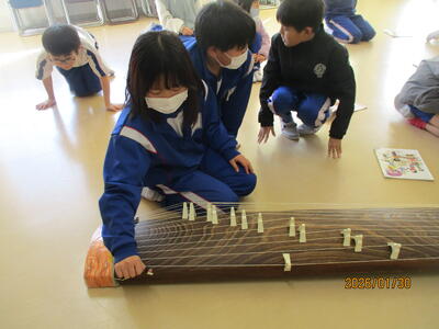 子供たちは初めて体験する琴に興味津々で、身を乗り出しながら見たり聞いたりして、琴に触れていました。地域ボランティアの先生、ありがとうございました。