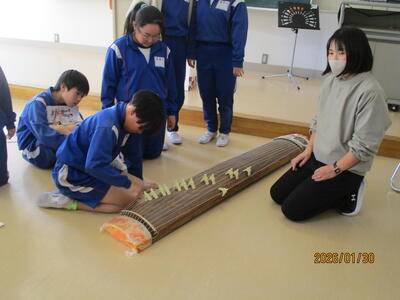 地域ボランティアの方を先生にお迎えし、琴の体験をしました。琴の基本と合わせて、名曲「さくらさくら」の演奏をめあてにして取り組みました。