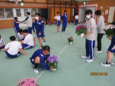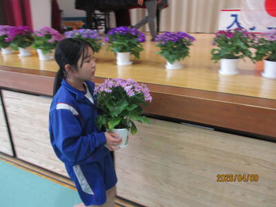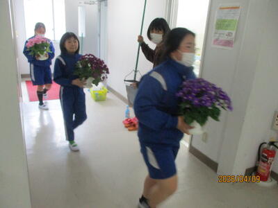 来賓玄関 入学式に備えて、お花がたくさん準備されています。