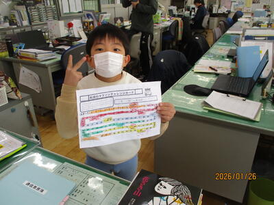 マラソン週間2週目に入り、頑張りカードが進んできました。職員室の先生にはんこをもらうためにやってきた児童は、自信満々で達成感に満ちあふれていました。